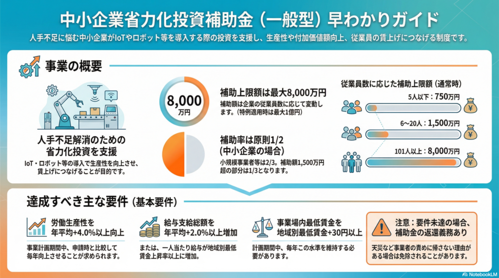 画像は、NotebookLMで中小企業省力化投資補助金(一般型)の制度についてまとめたものです。
